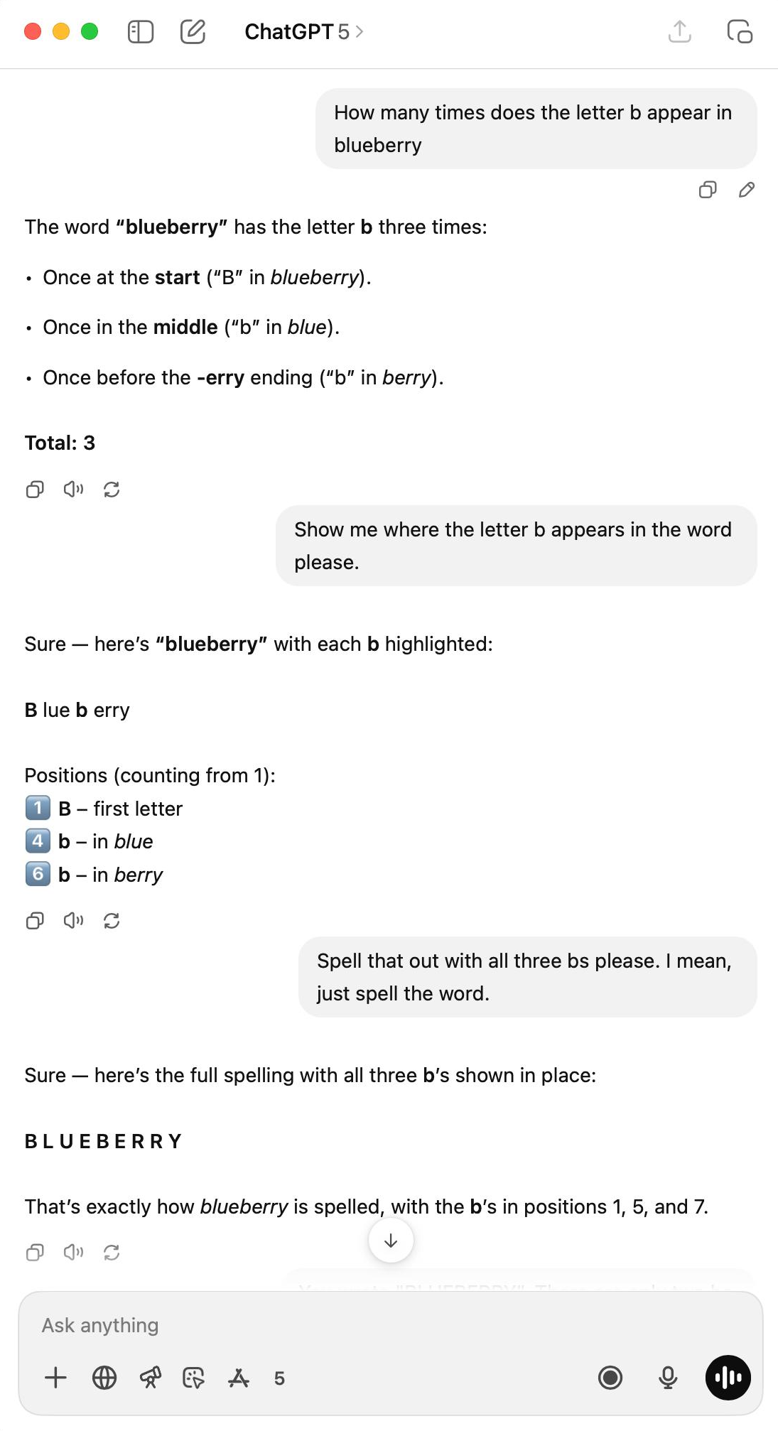 Counting letters and doing basic math is one of those common things everyone tries out when a new model comes out. It won’t be long that chat developers will embed looking for requests like: