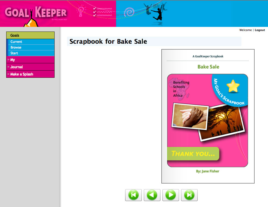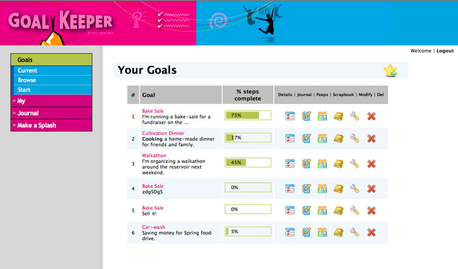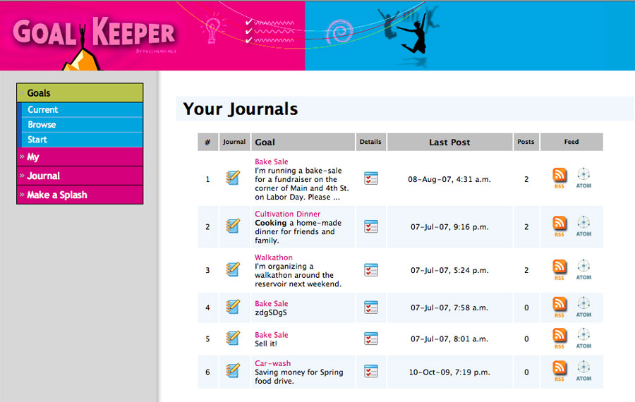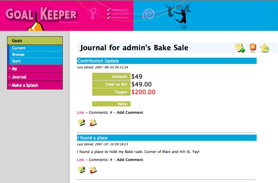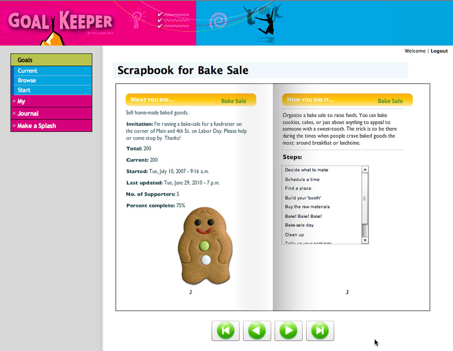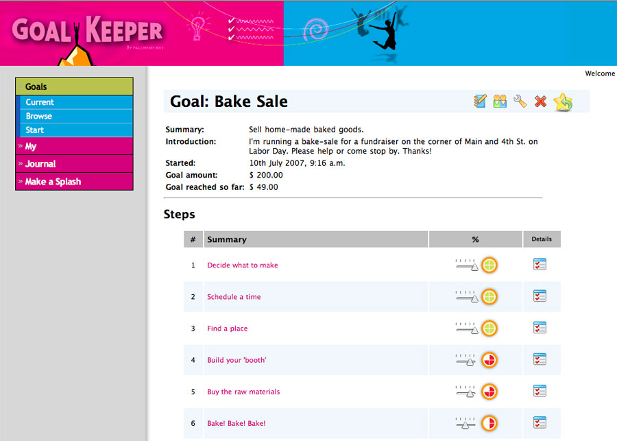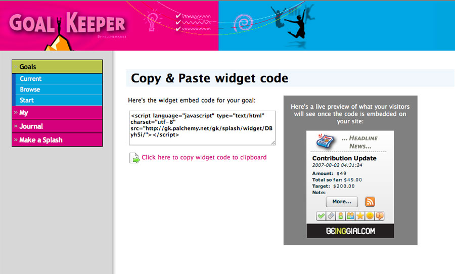 GoalKeeper featured a progress tracking Flash widget for embedding in Facebook or MySpace pages, RSS feeds for journals, and an animated scrapbook that could be e-mailed to supporters by way of thanks when the goal was achieved.