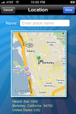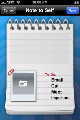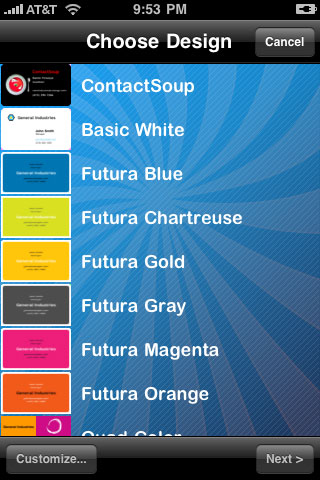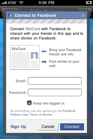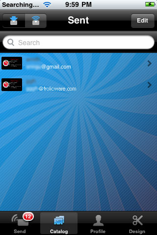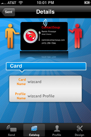 Cards could be selected from an animated carousel beamed via Bluetooth or WiFi to other iPhones or e-mailed to desktop users. WizCard could also record contextual reminders about the card exchange via GPS, camera, and notes.