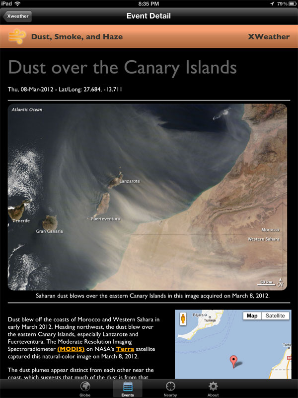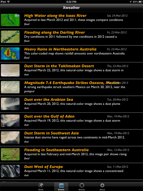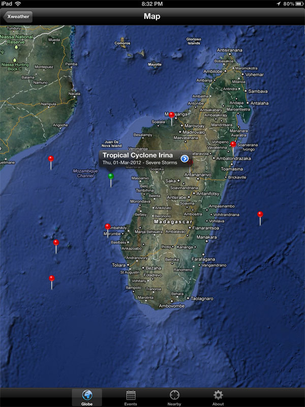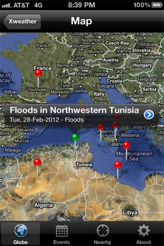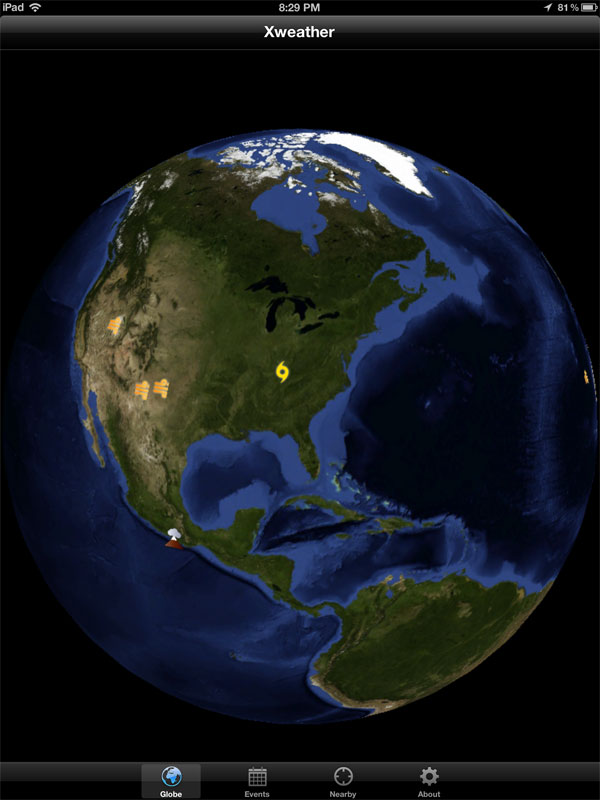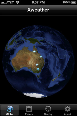 Mobile application to show extreme weather events on a 3D animated globe.