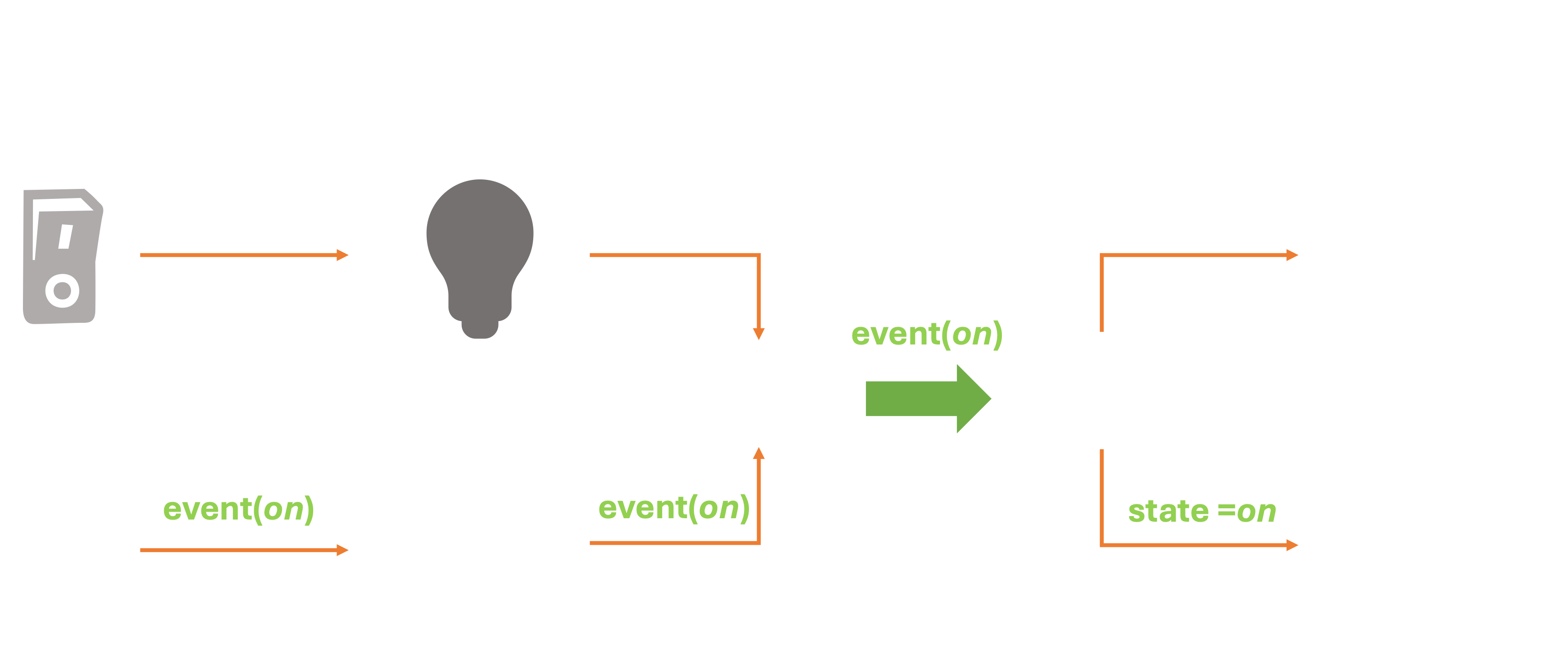 As an optimization, we can have the Physical device only send an event when the state changes (someone flips the switch). This generates an event that can then be transmitted to the Digital store on demand, saving a significant amount of energy, bandwidth, and processing power.