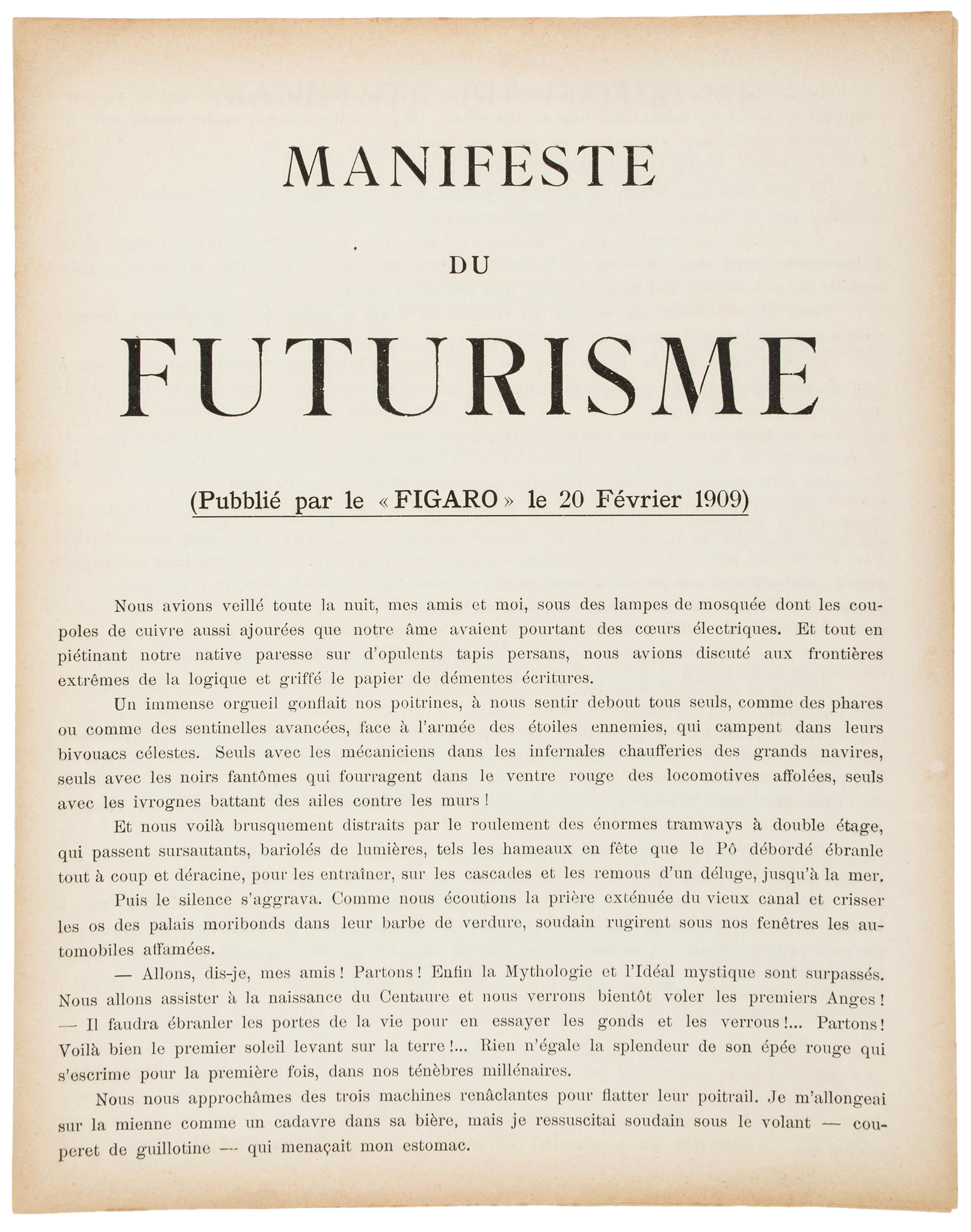 We declare that the splendor of the world has been enriched by a new beauty: the beauty of speed. A racing automobile with its bonnet adorned with great tubes like serpents with explosive breath ⦠a roaring motor car which seems to run on machine-gun fire, is more beautiful than the Victory of Samothrace.