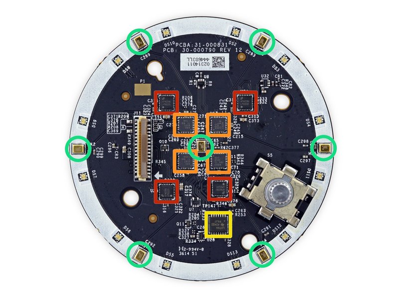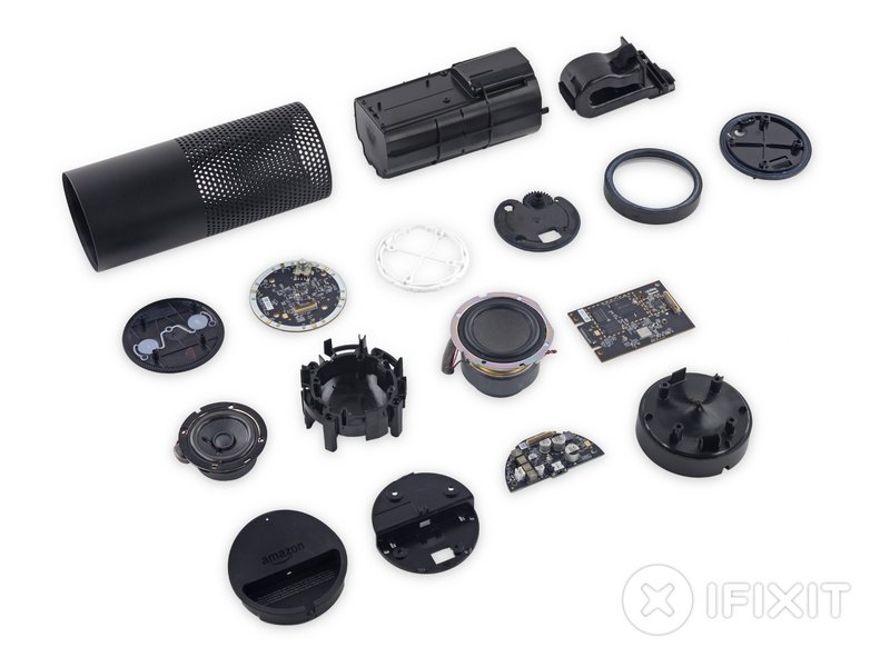 In the iFixit Amazon Echo breakdown, there are seven (7) microphones placed in a circular array (they’re the ones inside the little green boxes). These are used to allow the user to stand anywhere around the device. Background sound removal and noise cancellation as well as beam selecting algorithms enable an individual’s voice to be detected even in a noisy environment. These and other features like echo cancellation allow the user’s voice command to be isolated even if a smart speaker or phone is playing music.