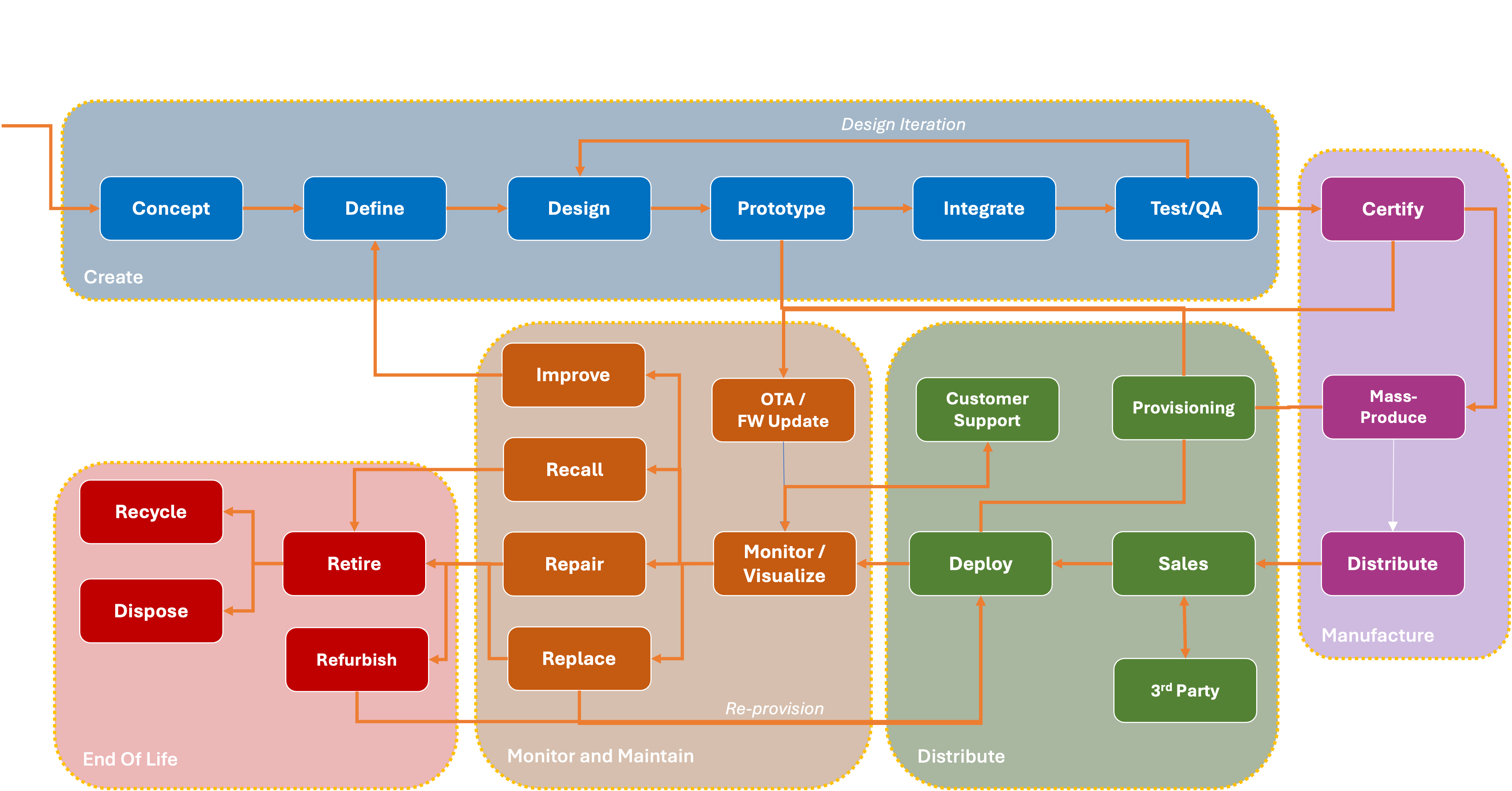 I made the Connected Device Lifecycle diagram to help explain to clients why making hardware takes so long, and to help development teams and PMs plan ahead. It has been vetted by many active professionals across a wide range of projects. ↩︎
