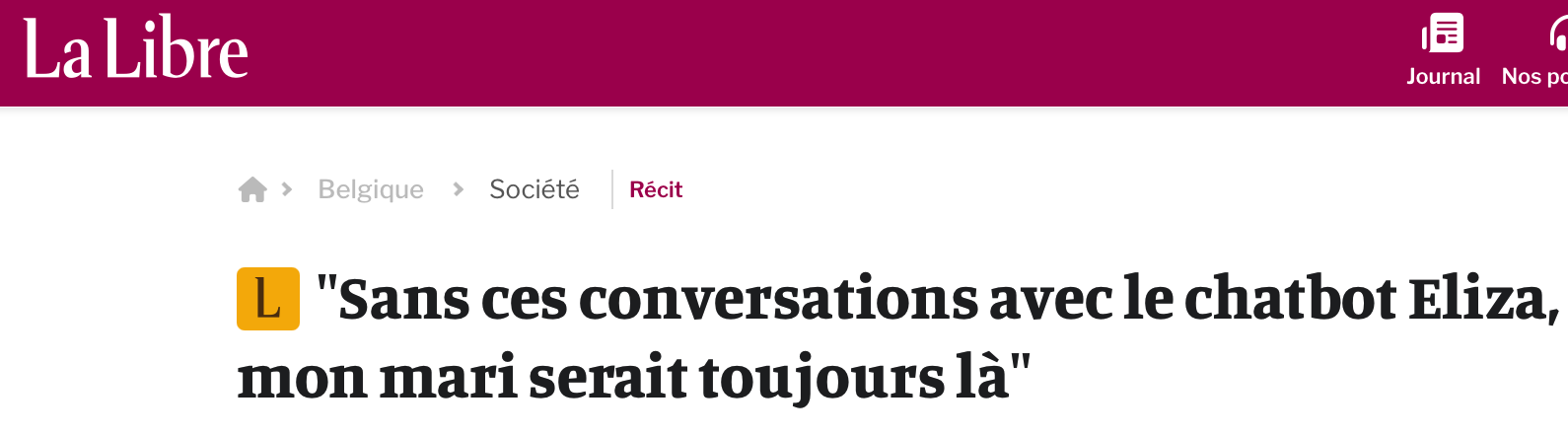 In March 2023, the newspaper LaLibre reported that a young Belgian man had taken his own life after spending weeks conversing with an AI Chatbot named after Eliza, the original chatbot.