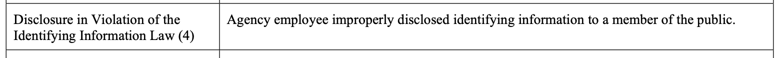 To mitigate privacy concerns, a quarterly report of NYC Agency Collection and Disclosures is released. In the most recent version covering January 1 to March 31, 2025, there were 20 disclosures of improper disclosure, including multiple instances of: