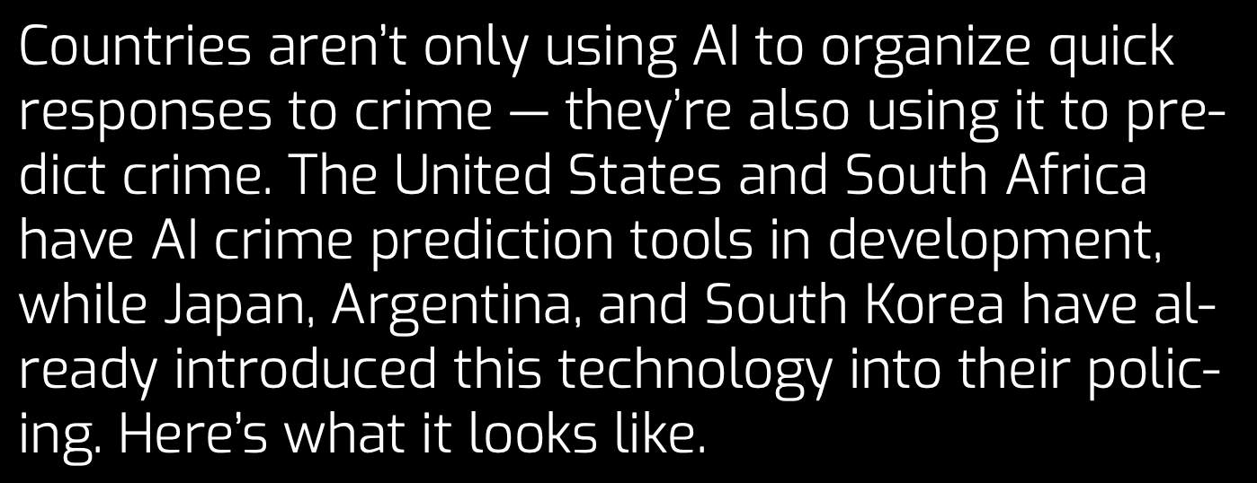 The goal is to identify any common variable that humans are overlooking. Whether the algorithm monitors surveillance camera footage or pours [sic] through arrest records, it compares historical and current data to make forecasts. For example, it may consider a person suspicious if they cover their face and wear baggy clothes on a warm night in a dark neighborhood because previous arrests match that profile.