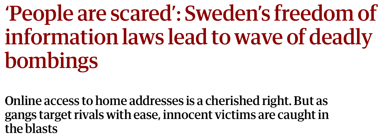 it is possible to find out the address and personal details of just about anybody with a single Google search . Experts saycriminals are being greatly helped by a 248-year-old law , forming part of Sweden’s constitution.…