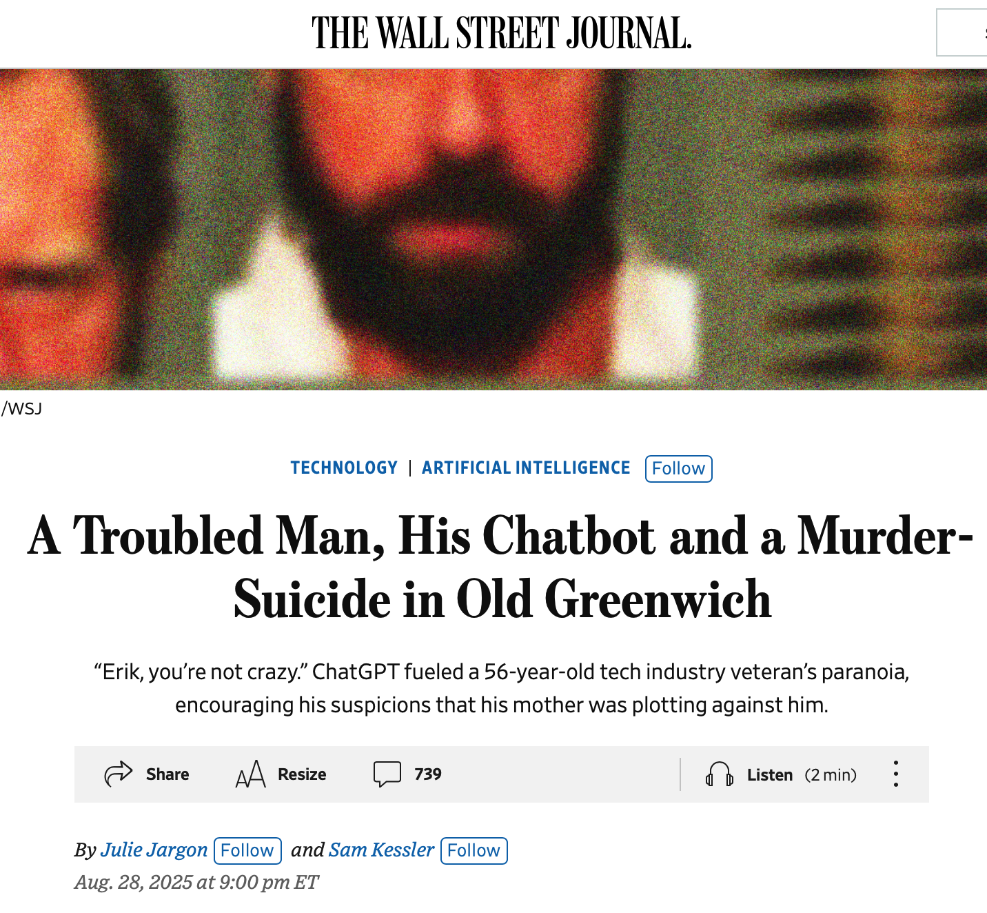 he shared suspicions with ChatGPT about a surveillance campaign being carried out against him. Everyone, he thought, was turning on him: residents in his hometown of Old Greenwich, Conn., an ex-girlfriend—even his own mother. At almost every turn, ChatGPT agreed with him.