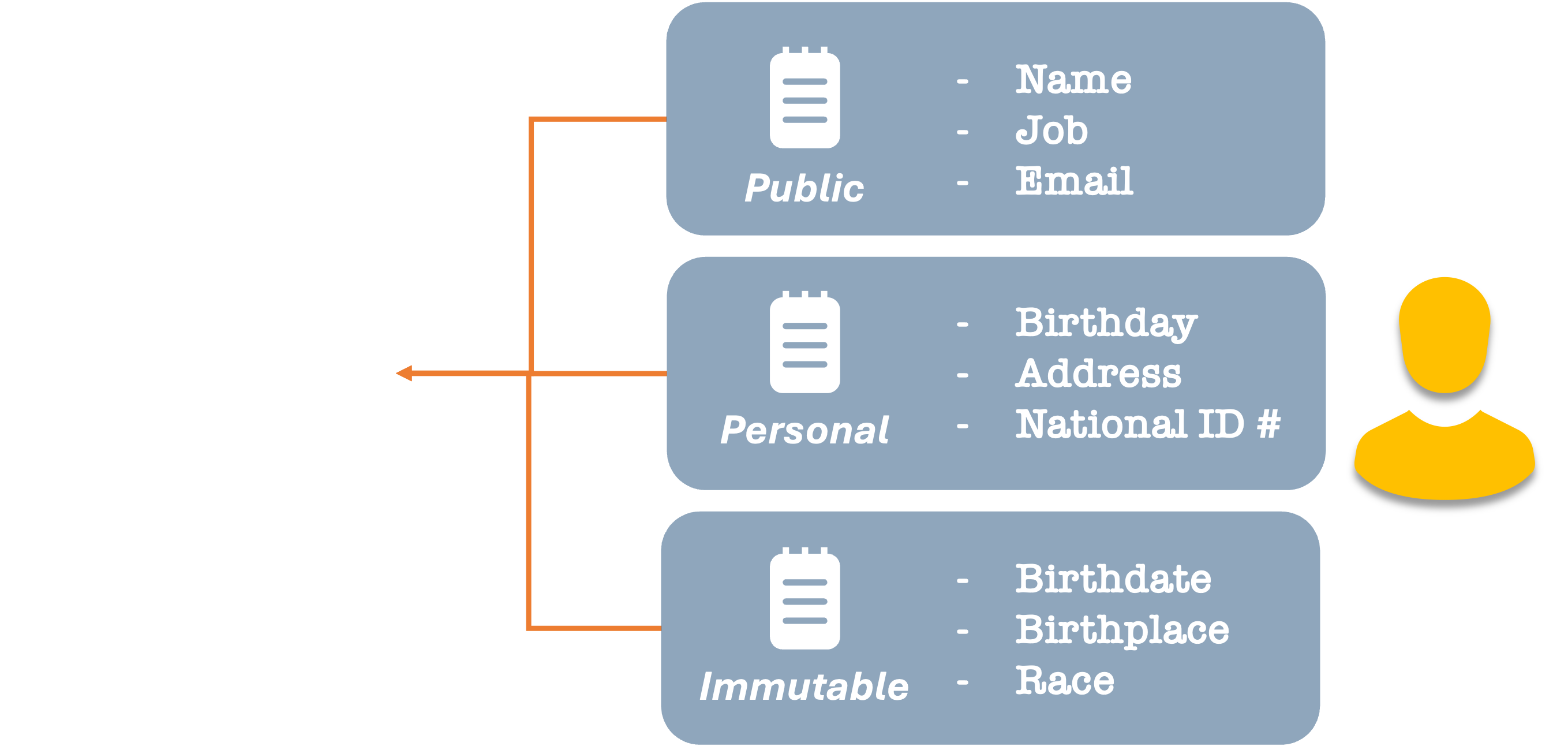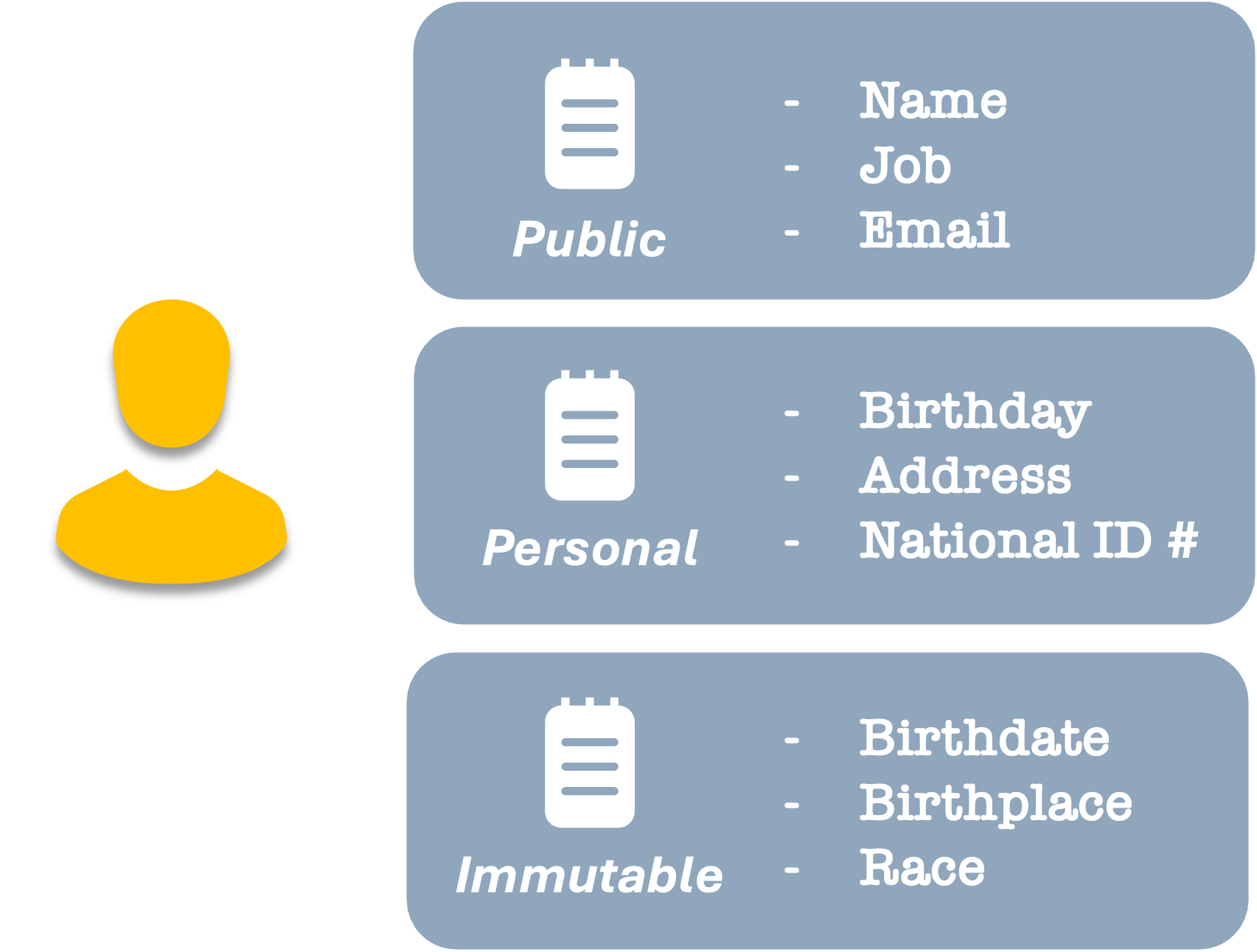 For example, our name may be public, but we may want to keep our bank account number or sexual identity private. Data like where we were born, our birthday, or our race can not be changed (at least, until a real, working time machine is invented). These are considered fixed or immutable.