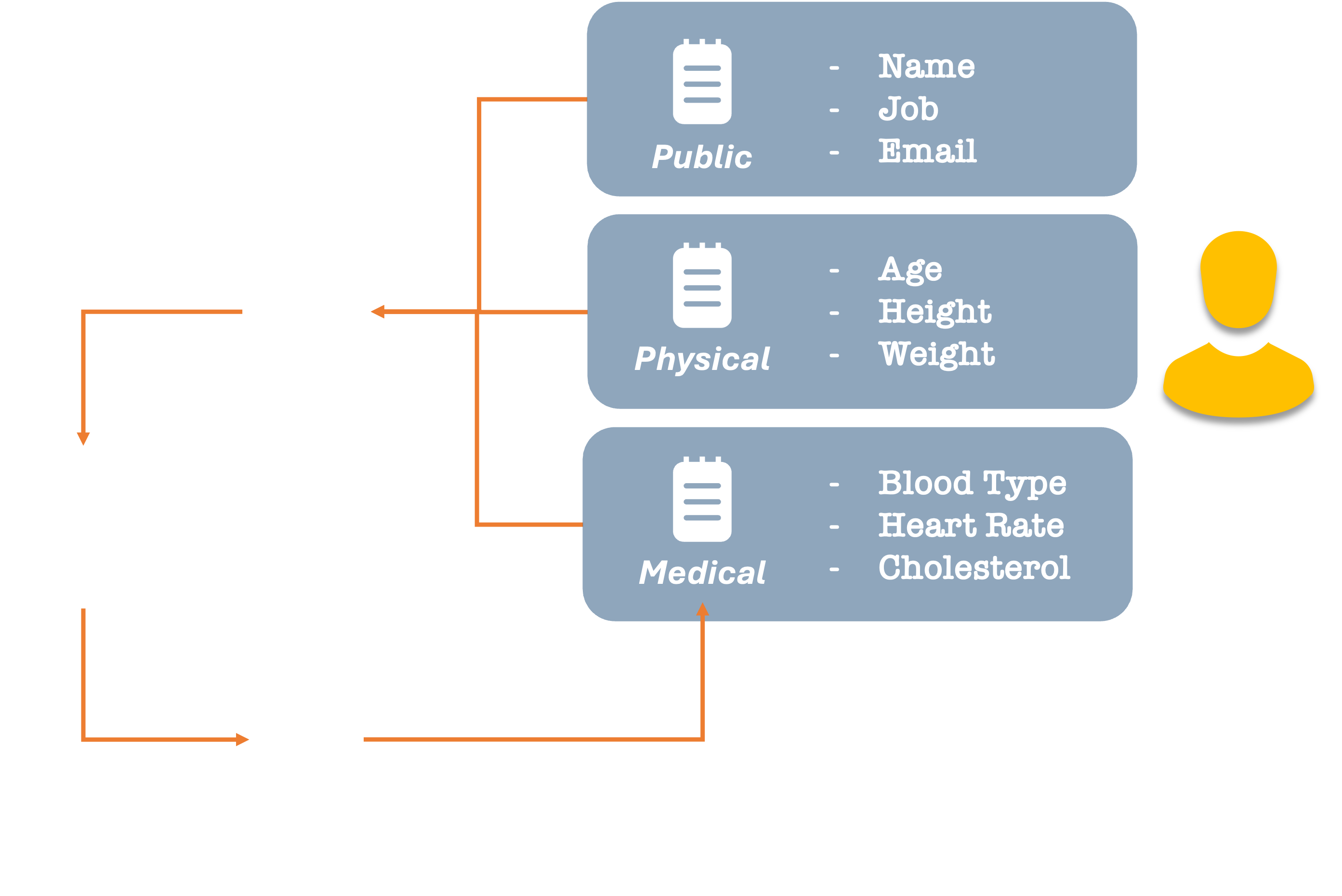 OK, let’s say we live in a magical wonderland where all your private data is stored in a super-secure database under your own control. Not everyone needs to be given access to every element everywhere. Remember those lenses we talked about? You would want to provide access to subsets for specific purposes.