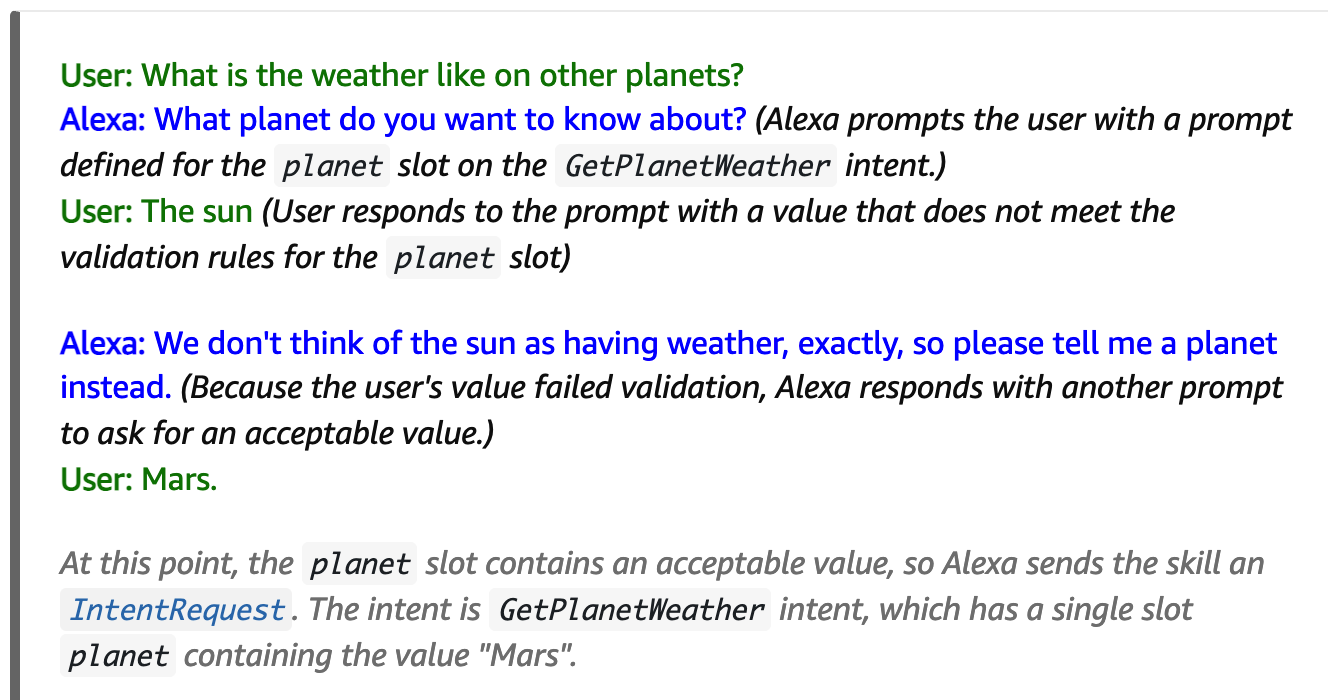 Skills support phrases with blank slots that are filled with a user’s utterances. This allows the system to determine the user’s Intent along with specific parameters.