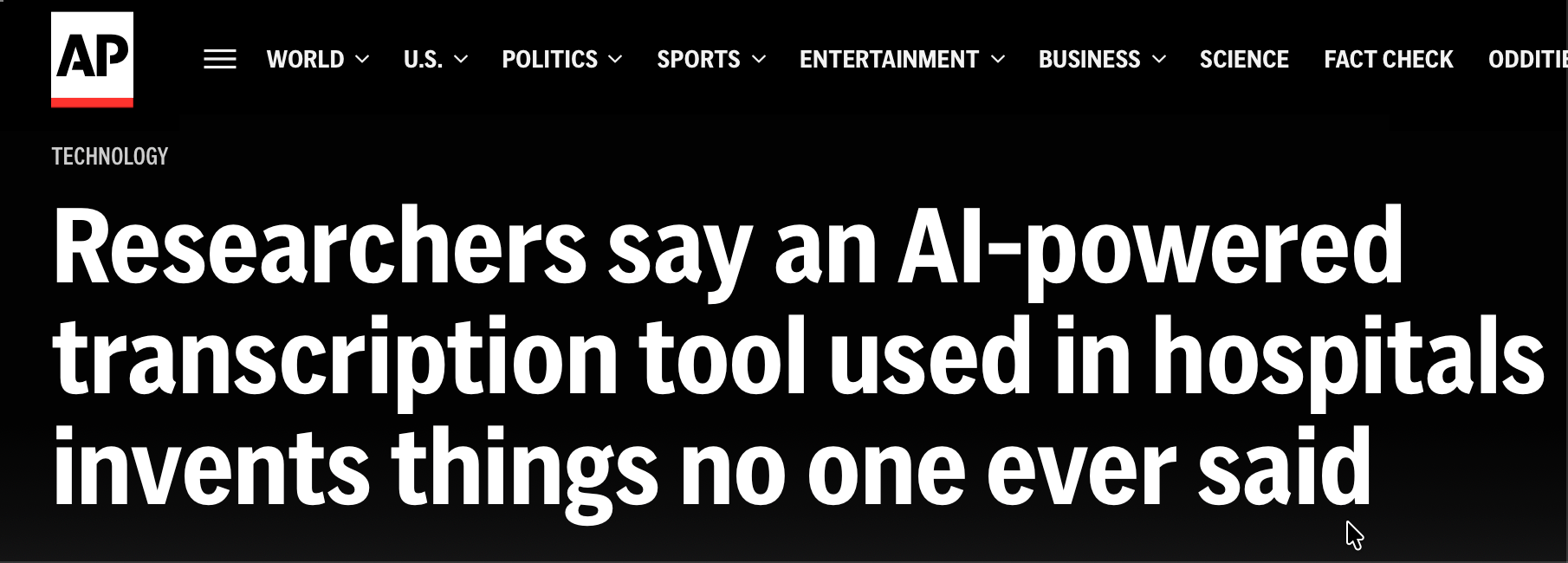 But Whisper has a major flaw: It is prone to making up chunks of text or even entire sentences, according to interviews with more than a dozen software engineers, developers and academic researchers. Those experts said some of the invented text — known in the industry as hallucinations — can include racial commentary, violent rhetoric and even imagined medical treatments.
